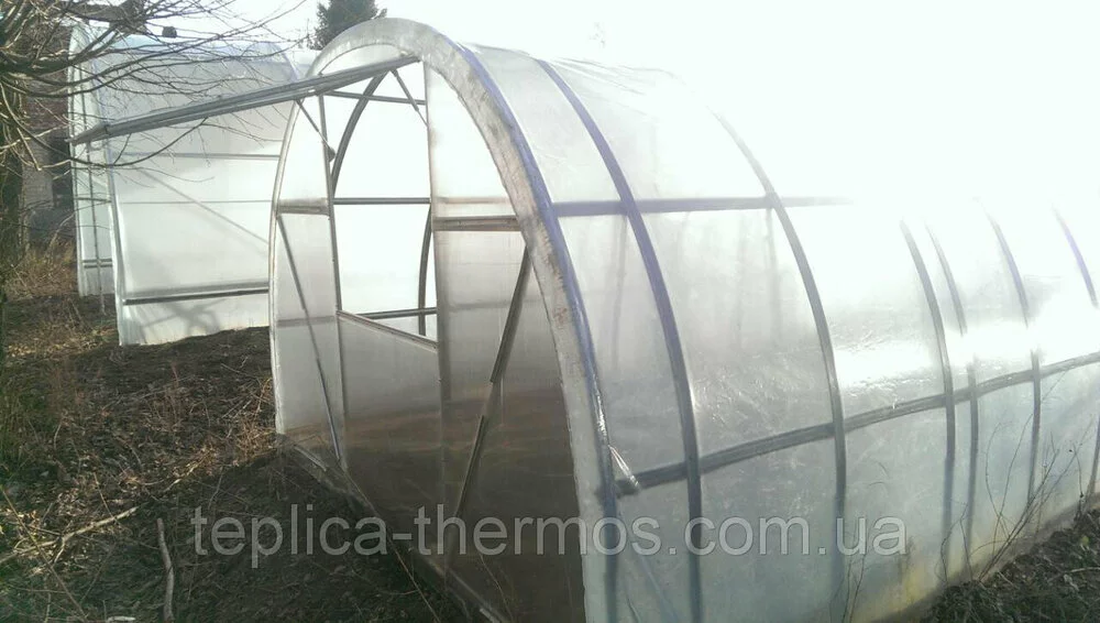 Каркас теплиці виготовлений з оцинкованого М-профіля, який має гарні антикорозійні характеристики та високу зносостійкість.Дверні блоки теплиці виготовлені з квадратної профільної оцинкованої труби 20*20 і комплектуються по два амортизатора на один віконний отец. Дверні блоки постачаються вже зібрані