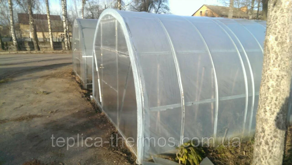 Каркас теплиці виготовлений з оцинкованого М-профіля, який має гарні антикорозійні характеристики та високу зносостійкість.Дверні блоки теплиці виготовлені з квадратної профільної оцинкованої труби 20*20 і комплектуються по два амортизатора на один віконний отец. Дверні блоки постачаються вже зібрані.Каркас теплиці накривається багатосезонною плівкою , а торці теплиці полікарбонатом завтовшки 4 мм